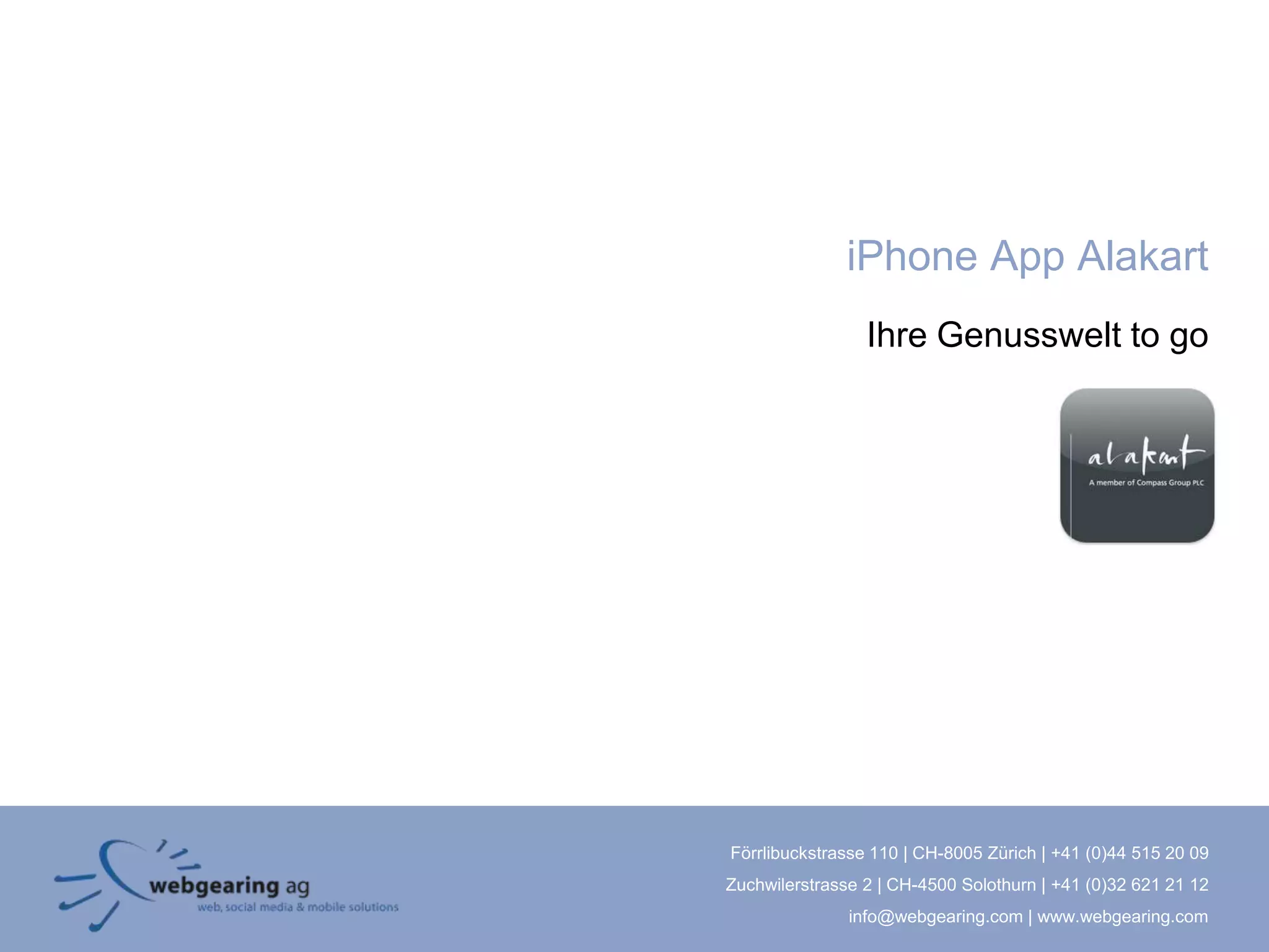 Die iPhone-App Alakart bietet Informationen über das Restaurantangebot in Zürich und ermöglicht flexibles Catering, Einkäufe und Blumenarrangements bis zu zwei Wochen im Voraus. Die App ist mehrsprachig und nutzt GPS zur Standortbestimmung. Bei Fragen können die Nutzer die Webgearing AG kontaktieren.