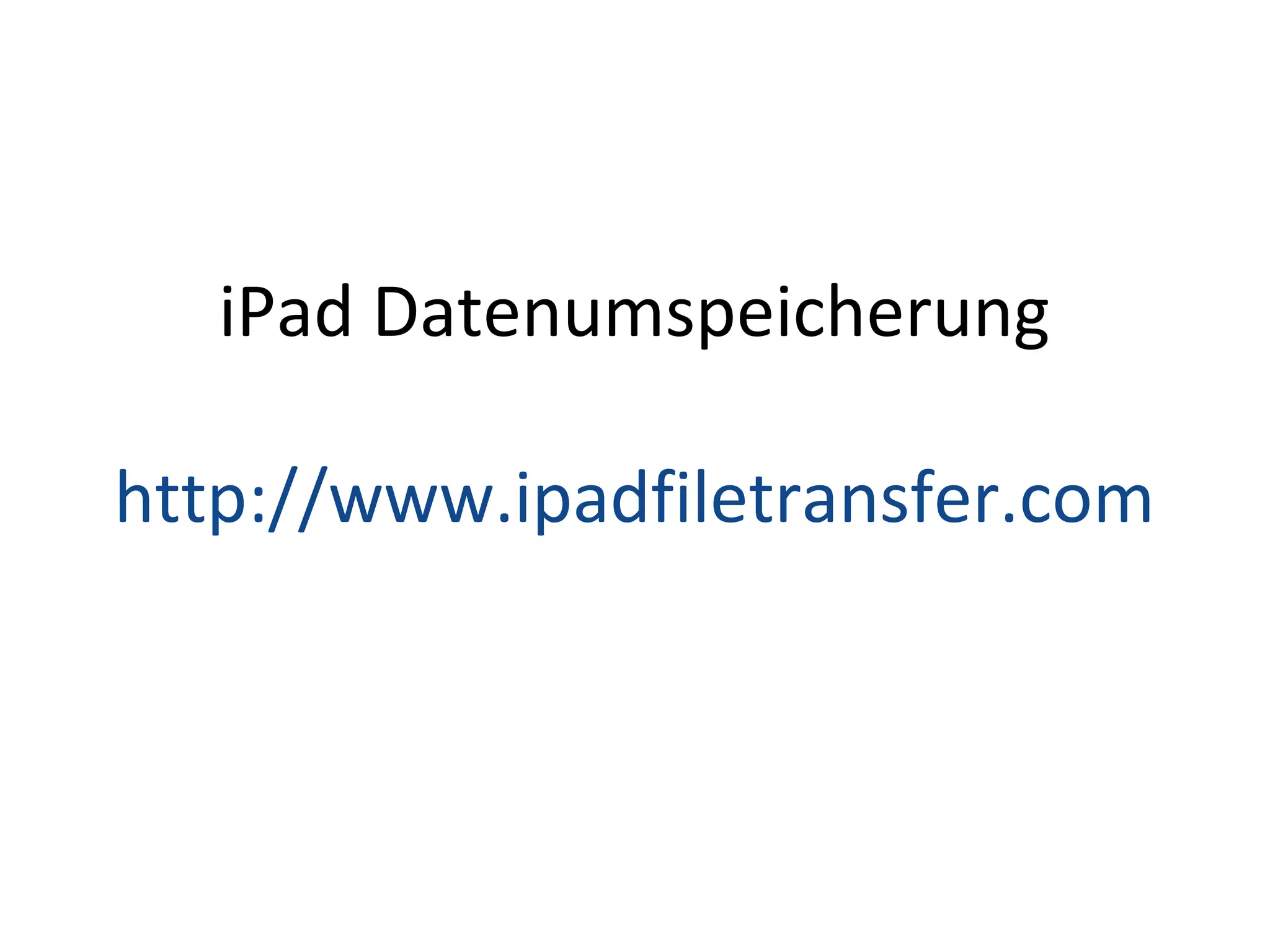 Das Dokument behandelt die Speicherung und Übertragung von Daten auf dem iPad, einschließlich der Verwendung von iPad File Transfer-Software. Es werden die Hauptmerkmale, Schritte zur Nutzung und Systemvoraussetzungen der Software beschrieben. Zudem wird auf die Notwendigkeit hingewiesen, Daten vor Beschädigung zu schützen und sicher zu übertragen.
