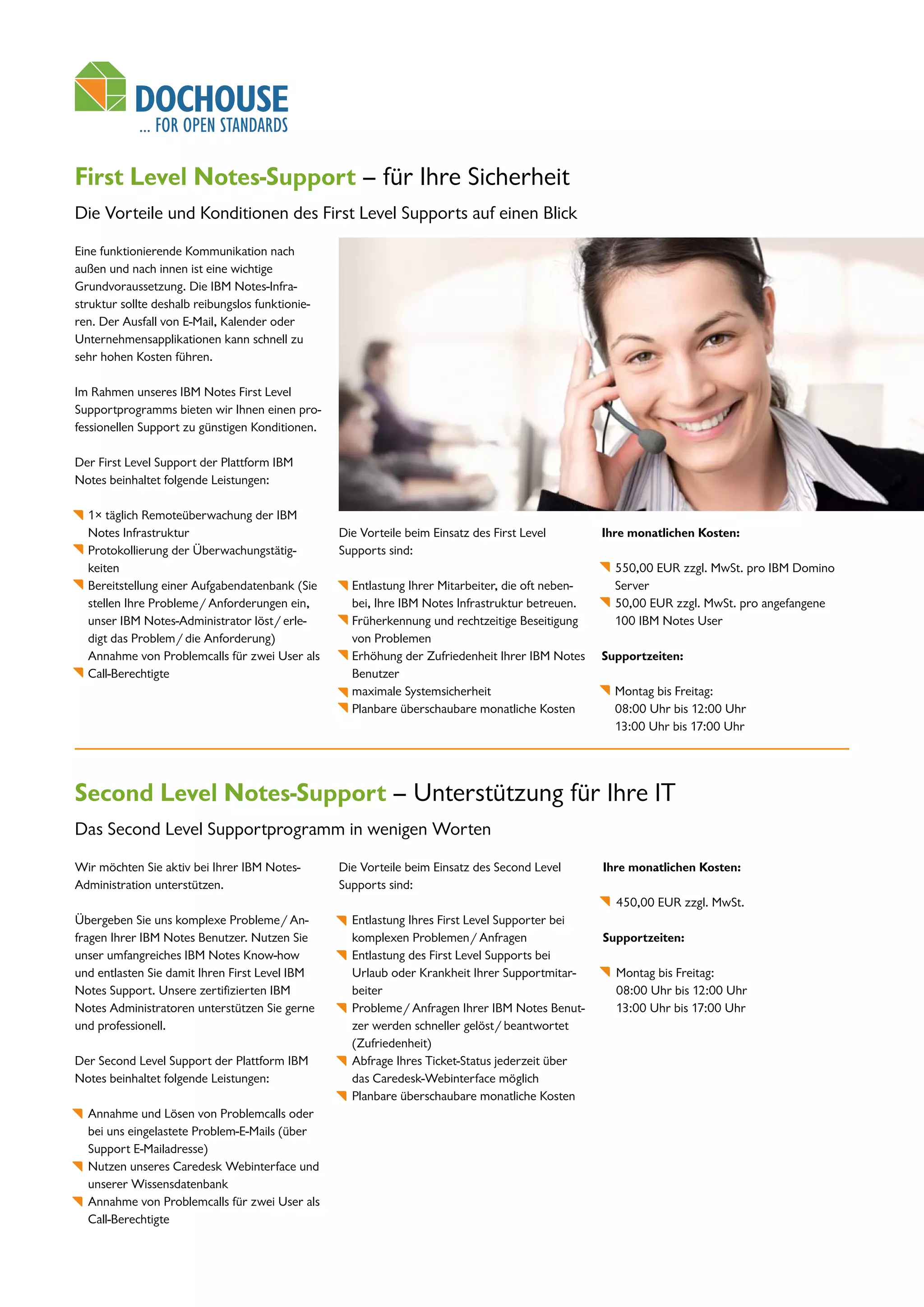 Das Dokument beschreibt die Angebote für First Level und Second Level Support der IBM Notes Infrastruktur durch Dochouse GmbH. Der First Level Support kostet 550 EUR pro Monat und umfasst tägliche Remoteüberwachung, Problemlösung und eine Aufgabendatenbank, während der Second Level Support für 450 EUR pro Monat komplexe Probleme bearbeitet und über zusätzliche Ressourcen verfügt. Beide Supportarten bieten planbare Kosten und sind von Montag bis Freitag erreichbar.