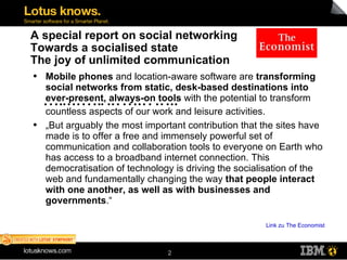 Das Dokument beschreibt, wie soziale Netzwerke durch mobile Technologien und Software transformiert werden und die Kommunikation und Zusammenarbeit in der Arbeitswelt revolutionieren. Es betont die Bedeutung der Integration sozialer Dienste in bestehende Anwendungen und die damit verbundene Effizienzsteigerung bei der Kommunikation. Zudem wird die Notwendigkeit hervorgehoben, auf die sich verändernden Erwartungen und Fähigkeiten der neuen Generationen in der Arbeitswelt zu reagieren.