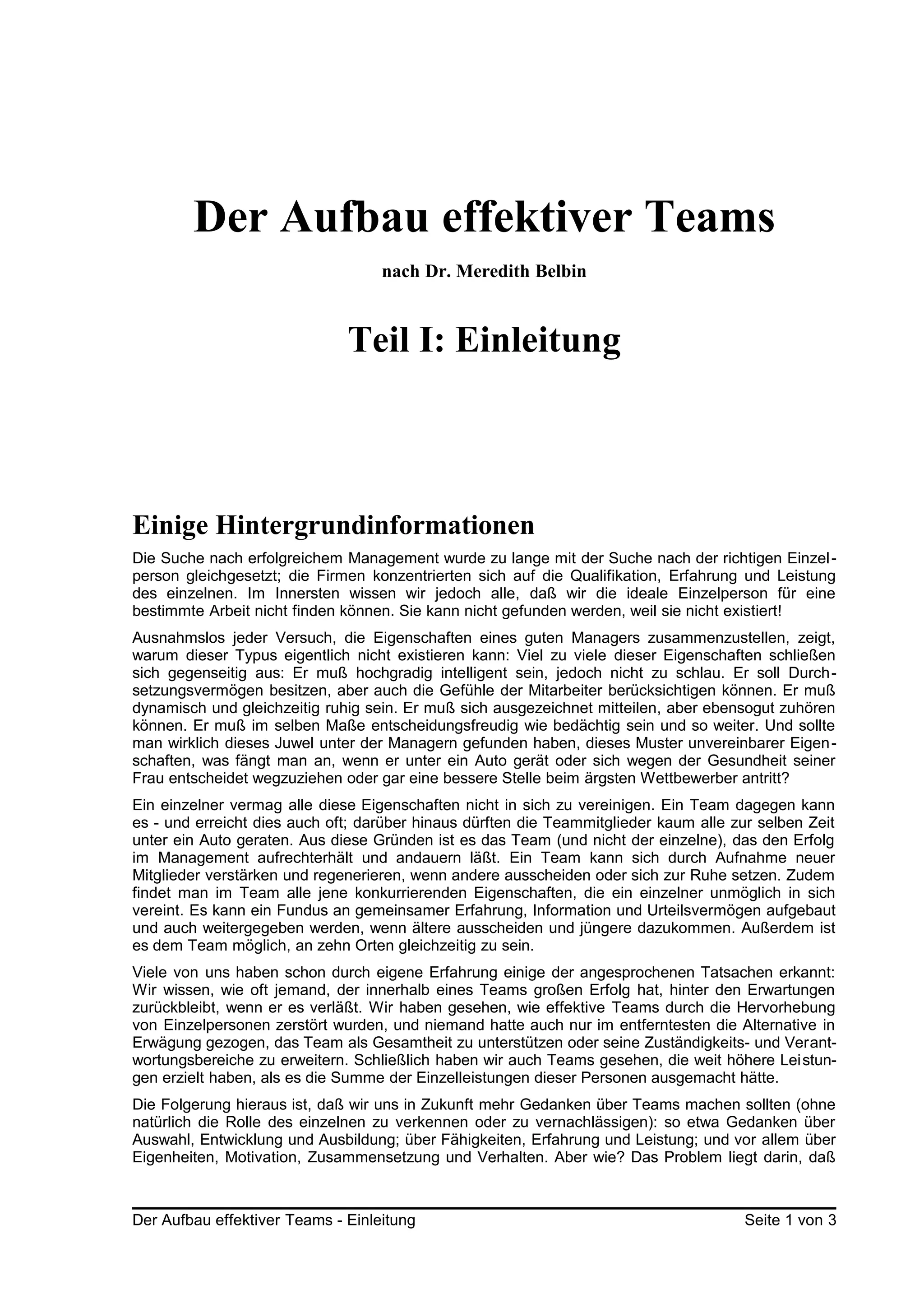 Das Dokument von Dr. Meredith Belbin befasst sich mit dem Aufbau effektiver Teams und argumentiert, dass der Erfolg im Management weniger von einzelnen Führungskräften, sondern vielmehr von der Teamdynamik abhängt. Belbin identifiziert acht verschiedene Teamrollen, die es ermöglichen, die Stärken eines Teams optimal zu nutzen und Herausforderungen zu bewältigen. Seine Forschung hebt die Bedeutung der Analyse von Teamzusammensetzung und -verhalten hervor, um die Leistung zu steigern und effektive Gruppen zu bilden.