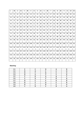 Das Dokument enthält eine Liste von Antworten oder Optionen, die von 1 bis 160 nummeriert sind. Jede Zahl ist mit einer oder mehreren Buchstaben gekennzeichnet, die offenbar verschiedene Antworten oder Kategorien darstellen. Die Struktur deutet darauf hin, dass es sich um Quiz- oder Umfrageantworten handelt.