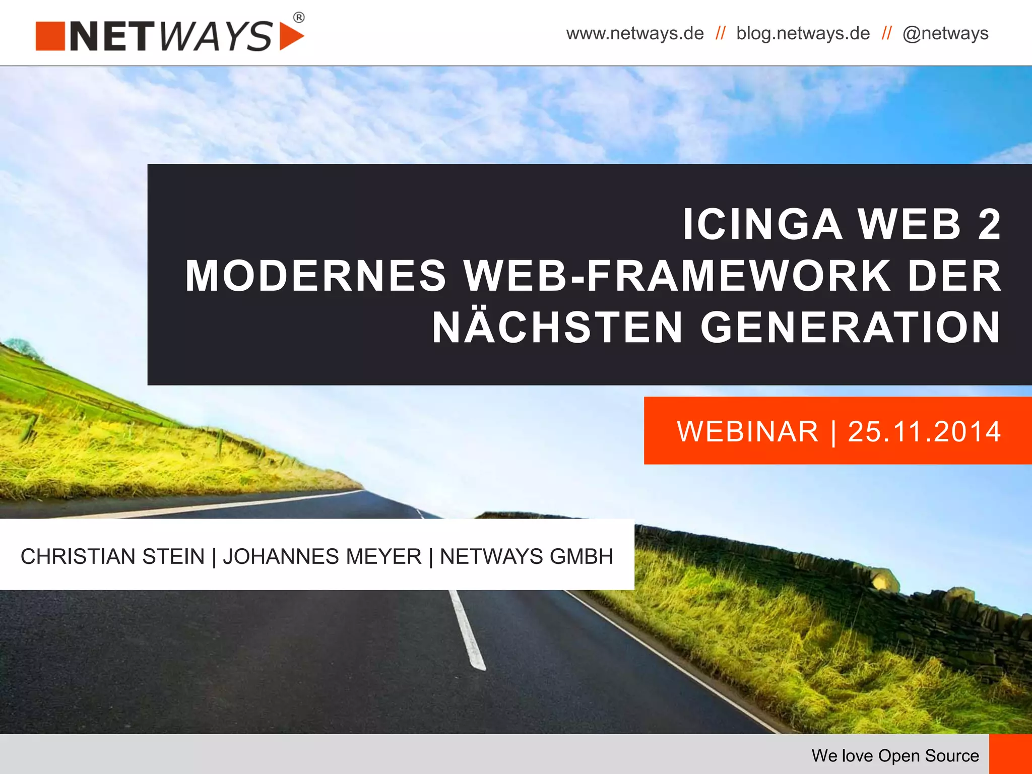 Das Dokument beschreibt eine Präsentation zu Icinga Web 2, einem modernen Web-Framework für das Monitoring, und stellt die Firma Netways vor, die seit 1995 auf Open Source spezialisiert ist. Es enthält Informationen zu den Kompetenzen und Produkten von Netways, bevorstehenden Konferenzen sowie Schulungsangeboten. Die Hauptfeatures von Icinga Web 2 sind unter anderem die volle Integration von Filtermöglichkeiten und die Unterstützung für verschiedene Plattformen und Versionen.
