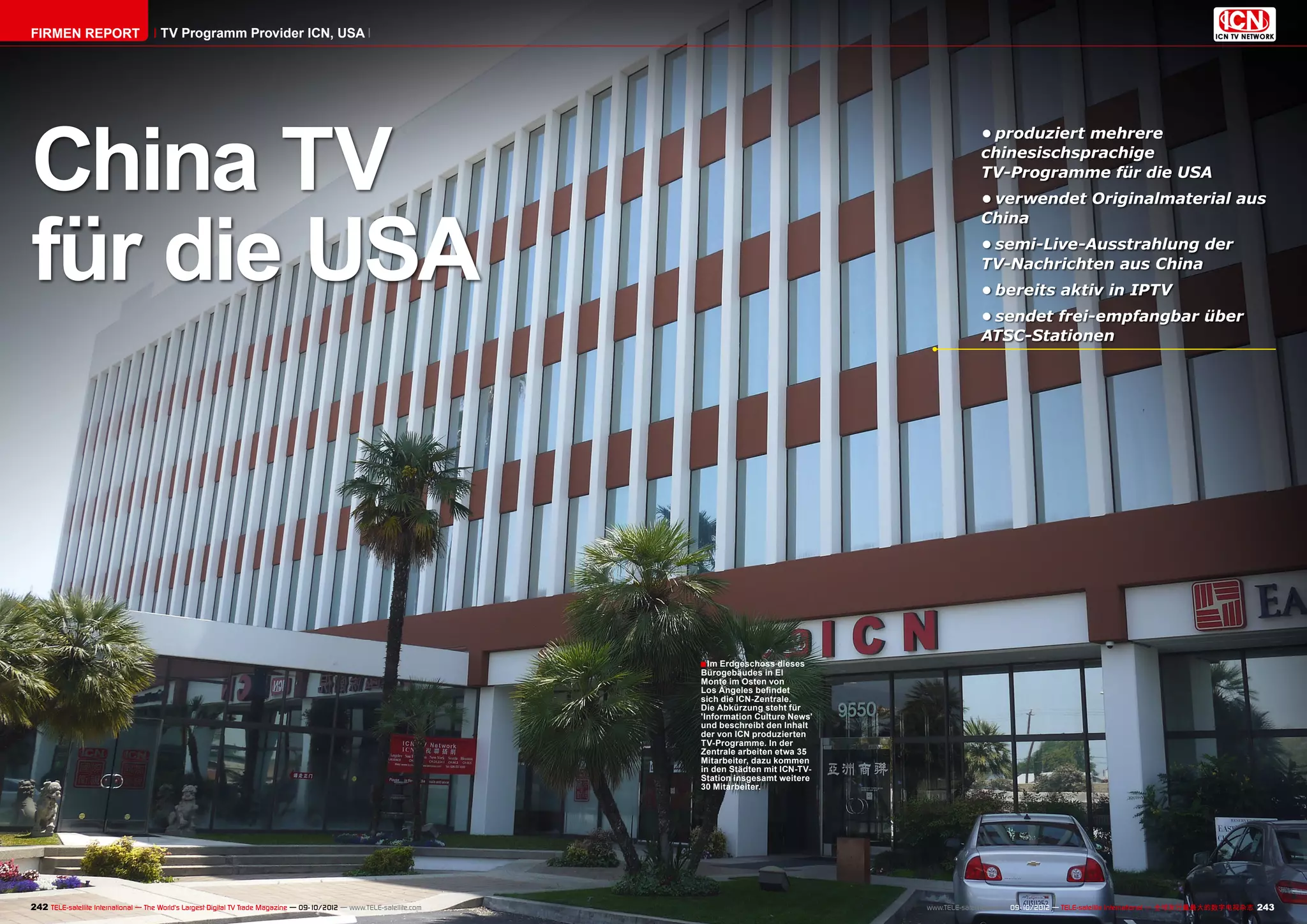 ICN ist ein in Los Angeles ansässiger Anbieter, der chinesischsprachige TV-Programme für die in den USA lebenden Chinesen produziert und ausstrahlt. Das Unternehmen verwendet Originalmaterial aus China und gewährleistet eine halb live Übertragung der Nachrichten, wobei es finanzielle Mittel aus Werbung, Abonnements und Veranstaltungen generiert. ICN plant, sein Sendernetz auf weitere Städte in den USA auszudehnen und sich kontinuierlich an die sich ändernden Anforderungen der Zuschauer und Werbekunden anzupassen.