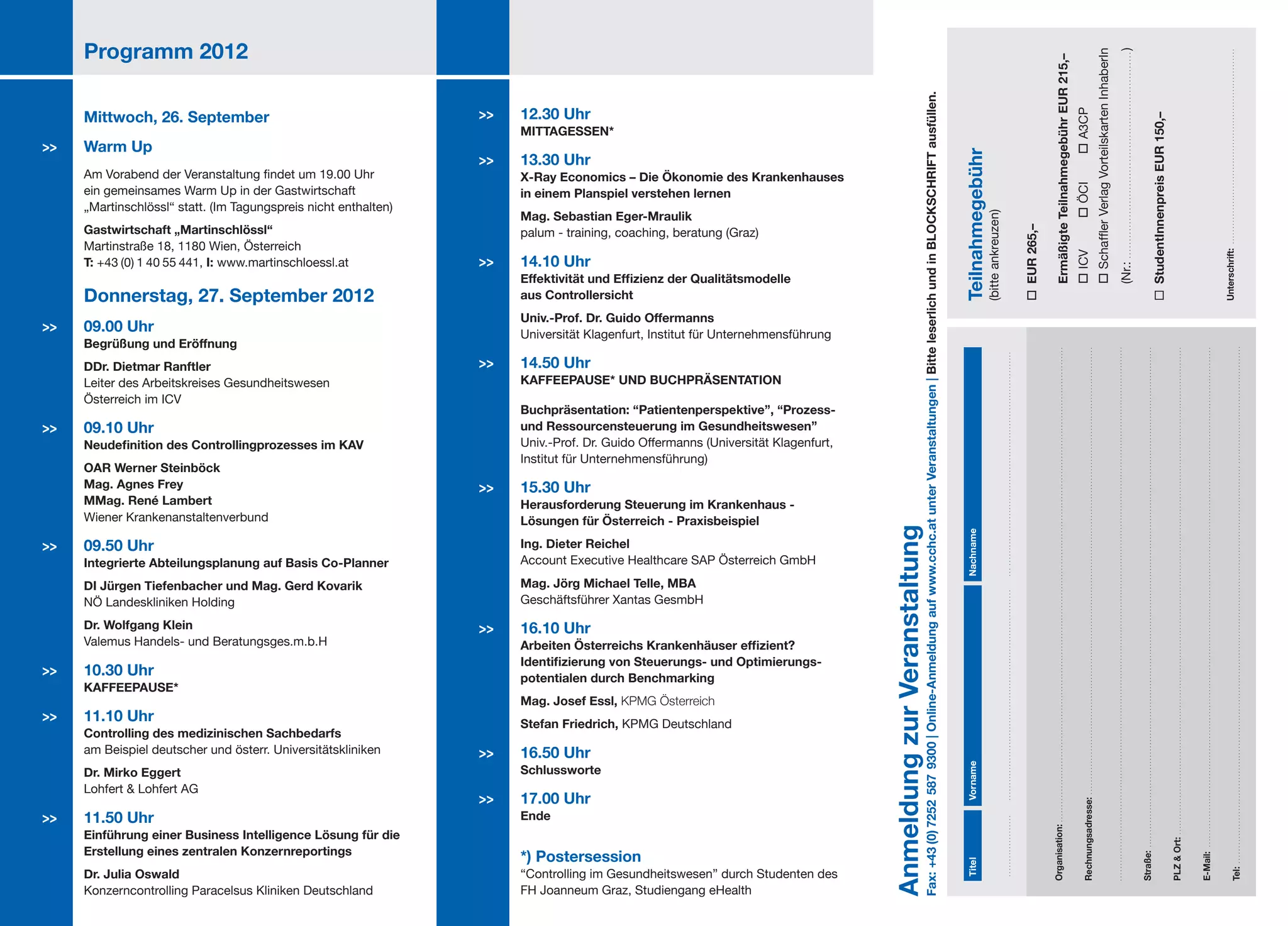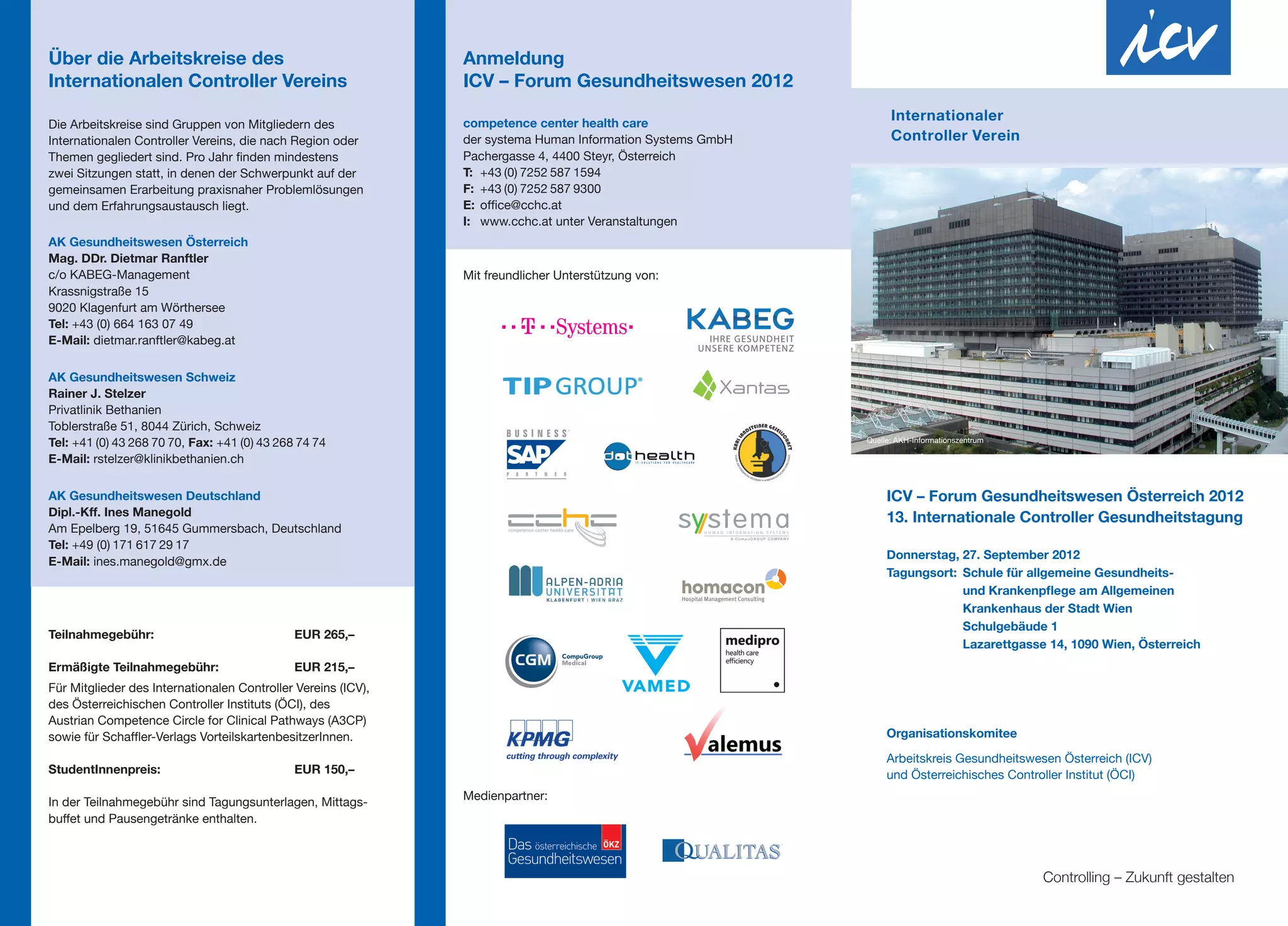 Die 13. internationale Controller-Gesundheitstagung findet am 27. September 2012 in Wien statt und bietet Veranstaltungen zu Themen wie Effizienz im Gesundheitswesen, Qualitätsmodelle und Krankenhaussteuerung. Die Teilnahmegebühr beträgt 265 Euro, mit ermäßigten Tarifen für Mitglieder des Internationalen Controller Vereins und Studenten. Die Tagung umfasst u.a. Vorträge von Experten, eine Buchpräsentation und eine Networking-Veranstaltung am Vorabend.