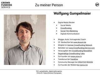 Das Dokument von Wolfgang Gumpelmaier behandelt das Thema Crowdfunding als eine Form der Finanzierung von Projekten durch große Gruppen, insbesondere vor dem Hintergrund der Entwicklung neuer Technologien und Plattformen im Internet. Es definiert Crowdfunding, skizziert verschiedene Arten und Plattformen und diskutiert Gründe und Beispiele für deren Nutzung. Gumpelmaier, als Experte in digitaler Kommunikation und Crowdfunding, bietet wertvolle Einblicke in die Funktionsweise und Vorteile dieser Finanzierungsform.