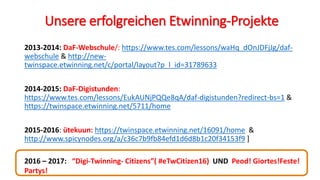Das Dokument beschreibt verschiedene Projekte zur Online-Motivation von Schülern im DaF-Unterricht durch die Plattform eTwinning von 2013 bis 2017, einschließlich der Nutzung innovativer Web 2.0-Tools. Die Projektpartner aus Estland und Griechenland tauschten Best-Practice-Beispiele aus und förderten das Lernen in Echtzeit durch digitale Zusammenarbeit. Dabei wurden positive Effekte auf die Lernatmosphäre und das Selbstbewusstsein der Schüler festgestellt.