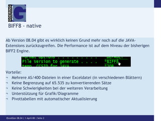 Die Version 08.04 von iexcelgen bietet Verbesserungen wie die vollständige Integration der biff8-Engine und die Unterstützung von Unicode-Zeichensätzen, wodurch die Verarbeitung von Excel-Dateien effizienter wird. Funktionen wie die Erstellung von Pivot-Tabellen, flexible Diagramme und die Möglichkeit, mehrere Anhänge in einer E-Mail zu versenden, werden hervorgehoben. Darüber hinaus ist die Software für mobile Geräte optimiert und unterstützt die neuesten Windows Mobile-Versionen.