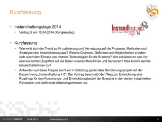 Das Dokument präsentiert das Sondierungsprojekt "Instandhaltung 4.0", das die Auswirkungen der vierten industriellen Revolution auf die Instandhaltungsprozesse in Unternehmen untersucht, insbesondere im Hinblick auf Virtualisierung und Internet-Technologien. Es diskutiert Chancen, Risiken und Strategien für die Branche und erstellt eine roadmap für zukünftige Forschungs- und Entwicklungsbedarfe. Zudem werden verschiedene Forschungsbereiche, Projektpartner und Methoden zur Analyse der Bedürfnisse der Instandhaltungsbranche beschrieben.