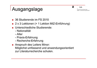 Der Recherchekurs an der KFH-Tagung am 14. Juni 2010 umfasste 36 Studierende mit unterschiedlichen Hintergründen und zielte darauf ab, umfassende und anwendungsorientierte Literaturrecherche zu schulen. In einem dreitägigen Workshop wurden Problembasiertes Lernen und Seminarmethoden eingesetzt, um die Recherchefähigkeiten zu fördern, wobei die Studierenden Rechercheergebnisse zu verschiedenen Themen präsentierten. Herausforderungen waren der enge Zeitplan und die große Gruppe, während die Zusammenarbeit mit anderen Fachbereichen als positiv wahrgenommen wurde.