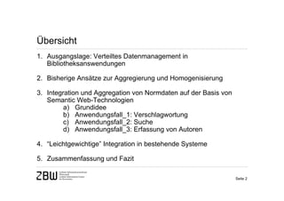 Das Dokument behandelt die Integration von Normdaten in Bibliotheksanwendungen unter Verwendung von Semantic Web-Technologien, um die Herausforderungen des verteilten Datenmanagements und die Schwierigkeiten bei der Aggregierung und Homogenisierung von Metadaten zu bewältigen. Es werden verschiedene Anwendungsfälle für die Nutzung von Normdaten, wie Verschlagwortung, Suchoptimierung und Autorenerfassung, vorgestellt. Zudem wird die Möglichkeit einer leichtgewichtigen Integration in bestehende Systeme thematisiert, um die Qualität der Metadaten und damit die angebotenen Dienste zu verbessern.