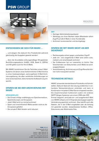 Das Dokument beschreibt die rechtssichere Archivierung von E-Mails mit der Lösung von imarc, die auf den rechtlichen Anforderungen der deutschen und internationalen Gesetzgebung basiert. Die Software ermöglicht eine revisionssichere Speicherung und schützt vor unbefugtem Zugriff, während sie gleichzeitig die Produktivität erhöht und Kosten senkt. Zudem kann die Lösung problemlos in bestehende Netzwerk- und E-Mail-Systeme integriert werden.