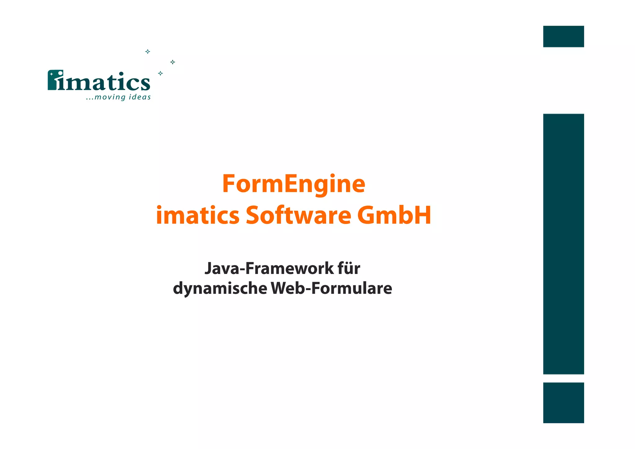 Die Imatics Software GmbH bietet ein Java-Framework zur dynamischen Erstellung von Webformularen, das eine Laufzeit-Formulardefinition über Java-API oder XML ermöglicht. Es bietet Funktionen wie sofortige Validierung, dynamische Berechnungen, hierarchische Datenstrukturen und einfache Integration in HTML-Seiten sowie flexible Erweiterbarkeit. Seit seiner Einführung im Jahr 2009 wird die Technologie in zahlreichen Projekten und von mehreren IT-Systemhäusern in D-A-CH verwendet.