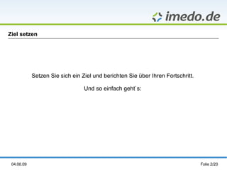 Das Dokument beschreibt, wie Benutzer auf der Plattform imedo.de Ziele setzen und ihren Fortschritt verfolgen können. Es erklärt den Prozess der Zielsetzung, einschließlich der Auswahl von Vorlagen, dem Einladen von Freunden zur Motivation und der grafischen Darstellung von Fortschritten. Nutzer werden ermutigt, sowohl eigene Ziele zu erreichen als auch andere Mitglieder zu unterstützen.