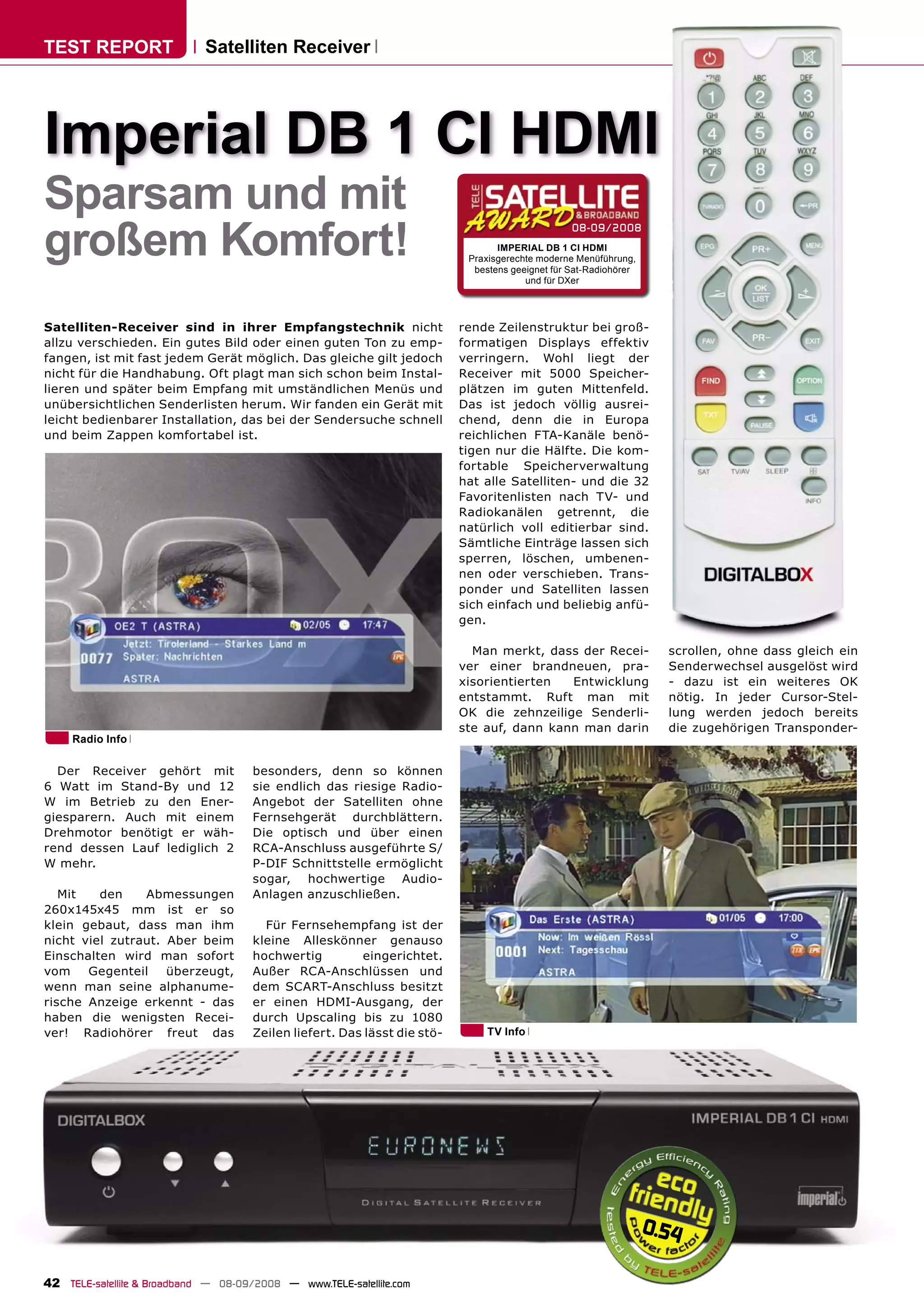 Der Testbericht beschreibt den Satellitenreceiver Imperial DB 1 CI HDMI als benutzerfreundliches Gerät mit effizienter Speicherverwaltung, das stimmige Leistung bei der Sendersuche und Bedienung bietet. Dank seines kompakten Designs und moderner Schnittstellen wie HDMI und Scart erweist sich der Receiver als energieeffizient und leistungsstark für den Empfang von TV- und Radiosendern. Besondere Funktionen sind die einfache Handhabung von Favoritenlisten, die Unterstützung für mehrere Satelliten und ein ausgeklügeltes EPG-System.