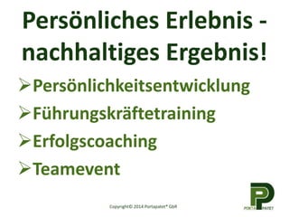 Das Dokument beschreibt ein pferdegestütztes Training und Coaching, das sich auf die persönliche Weiterentwicklung, Führungskräfte-Trainings und Team-Events konzentriert. Pferde fungieren als Impulsgeber, die durch unmittelbares Feedback die Selbstwahrnehmung und Authentizität der Teilnehmer fördern. Die Seminarinhalte beinhalten Achtsamkeit, Kommunikationsklarheit und die Balance in zwischenmenschlichen Beziehungen, zielt darauf ab, persönliche Stärken und Handlungsmöglichkeiten zu erkennen und auszubauen.