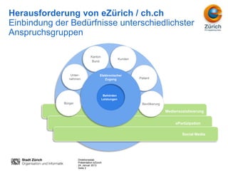 Die Präsentation von Michael Keller thematisiert die Herausforderungen und Strategien von eZürich zur Einbindung verschiedener Anspruchsgruppen, einschließlich der Verwaltung und Bevölkerung, in die Angebote des elektronischen Zugangs. Besondere Bedeutung kommt der Nutzung von Social Media als Kommunikationsinstrument zu, um die Bekanntheit der Plattform ch.ch zu steigern und die Bedürfnisse der Nutzer zu berücksichtigen. Die vorgestellten Maßnahmen umfassen Kampagnen in verschiedenen Medien sowie die Erweiterung von Nutzergruppen durch Vernetzung und direkte Ansprache.