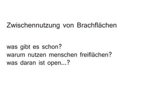 Das Dokument thematisiert die Partizipation im öffentlichen Raum und die Bedeutung von Mitbauprojekten zur Förderung gemeinschaftlicher Orte und kulturellem Erbe. Es untersucht die Nutzung von Freiflächen und deren Einfluss auf die Lebensqualität, ermutigt zur Selbstorganisation und zur Wiederbelebung von Brachflächen. Zusätzlich wird die Notwendigkeit betont, neue Tätigkeitsformen zu fördern und die Teilhabe an städtischen Entwicklungen demokratischer zu gestalten.