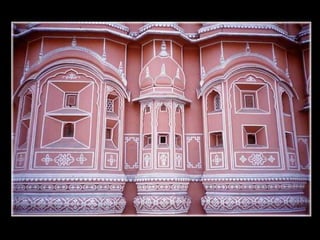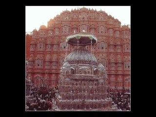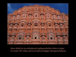 Hawa Mahal, auch bekannt als der 'Palast der Winde', ist ein außergewöhnlicher Palast in Jaipur, der 1799 erbaut wurde und für seine 953 kunstvoll gestalteten Fenster berühmt ist. Diese Fenster ermöglichen eine ständige Luftzirkulation und erlaubten den Frauen des Hofes, das Straßenleben unbeobachtet zu beobachten. Der Palast liegt östlich des Stadtpalastes in der Altstadt und war einst ein Wohnhaus des Harems.