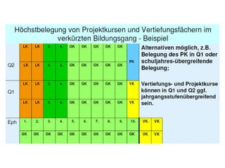 Das Dokument beschreibt die Struktur und Anforderungen der gymnasialen Oberstufe im achtjährigen Bildungsgang mit Fokus auf die Qualifikationsphase, Kursbelegung und Abiturprüfungen. Es listet die erforderlichen Fächer, deren Stundenzahl und die Wahlmöglichkeiten sowie verschiedene Projekt- und Vertiefungskurse auf. Zudem werden die Bedingungen für den mittleren Schulabschluss, die Zulassung zu Abiturprüfungen und die Notenberechnung erläutert.