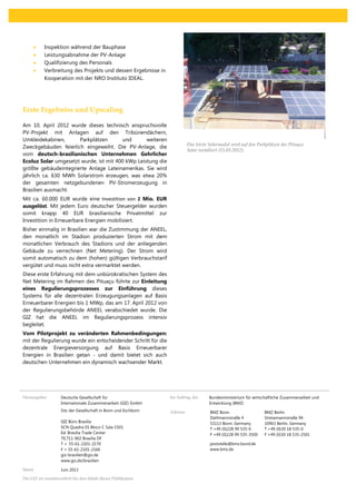 Das Dokument beschreibt die Entwicklung des ersten Solarstadions in Lateinamerika, das in Salvador da Bahia, Brasilien, errichtet wurde, um das Potenzial erneuerbarer Energien, insbesondere der Photovoltaik, zu fördern. Trotz Herausforderungen wie unzureichenden Kenntnissen und Finanzierungsmöglichkeiten im brasilianischen Energiesektor führte die Zusammenarbeit zwischen deutschen und brasilianischen Akteuren zu innovativen Projekten und bedeutenden regulatorischen Veränderungen. Die Einweihung der PV-Anlage im Jahr 2012 und die Einführung eines Net-Metering-Systems stellen wesentliche Schritte zur Dezentralisierung der Energieversorgung in Brasilien dar und eröffnen deutschen Unternehmen neue Marktchancen.