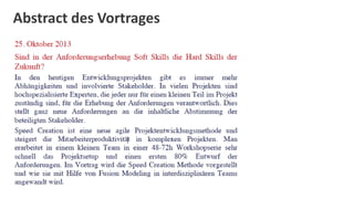 Matthias Pohle diskutiert in seiner Präsentation, wie Softskills in der Anforderungserhebung als essenzielle Hardskills der Zukunft gelten und beschreibt seinen Ansatz zur effizienten Umsetzung von Projekten durch Speed-Creation-Methoden. Diese Methoden fördern interdisziplinäre Zusammenarbeit und beschleunigen den Entwicklungsprozess, indem sie klare Erwartungen und ein gemeinsames Verständnis zwischen den Stakeholdern schaffen. Die Ergebnisse zeigen, dass Speed Creation den Zeitaufwand für die Entwicklung von Anforderungen signifikant reduziert und die Projektergebnisse verbessert.