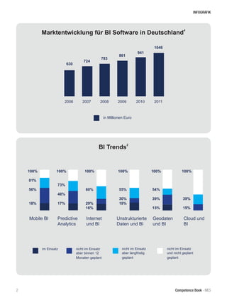 Das Dokument behandelt die aktuellen Trends und Herausforderungen im Bereich Business Intelligence (BI), einschließlich der Bedeutung von Datenqualität, flexibler Geschäftsführung und der Anwendung von Predictive Analytics. Es analysiert die Marktentwicklung für BI-Software in Deutschland und die Anwendung von Big Data sowie mobile BI. Zudem werden führende Anbieter und deren Lösungen im Bereich Business Performance Management vorgestellt.