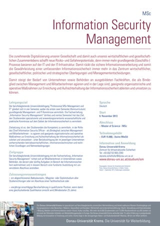 Der berufsbegleitende Universitätslehrgang 'Professional MSc Management und IT' an der Donau-Universität Krems umfasst vier Semester, wobei die Fachvertiefung 'Information Security Management' in den letzten beiden Semestern spezialisierte Kenntnisse in der Informationssicherheit vermittelt. Zielgruppe sind Mitarbeiter aus Unternehmen und Behörden, die Aufgaben im Bereich der Informationssicherheit übernehmen möchten und einen universitären Abschluss anstreben. Der Lehrgang beginnt am 6. November 2013 mit einer Teilnahmegebühr von 15.900 Euro.