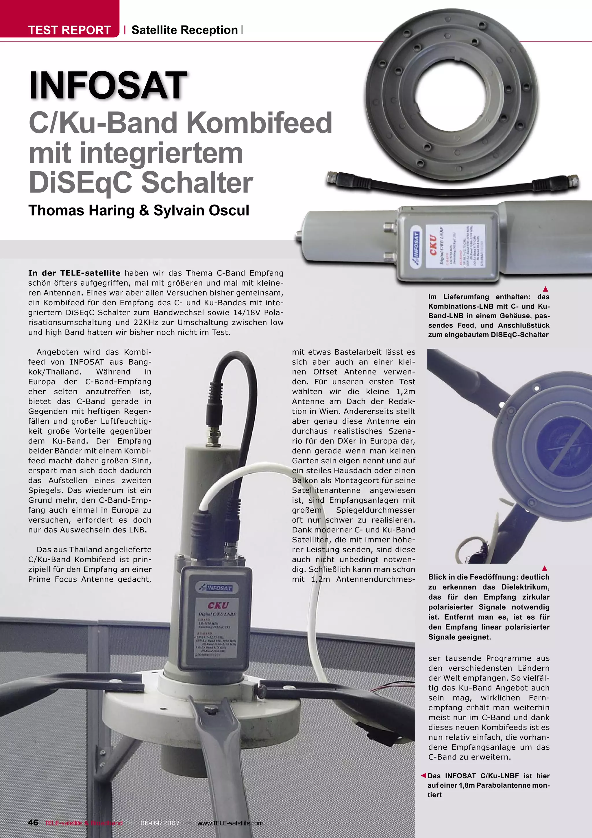 Der Testbericht bewertet das C/Ku-Band Kombifeed von Infosat, das den Empfang von C- und Ku-Band-Signalen mit einem integrierten Diseqc-Schalter ermöglicht. Trotz anfänglicher Herausforderungen bei der Montage und der Signalqualität zeigten die Tests, dass das Kombifeed vor allem bei starken C-Band-Signalen eine zuverlässige Leistung erbringt und somit für Nutzer in Europa sinnvoll ist, die auf bestehende Antennen setzen möchten. Zudem wird betont, dass die Erweiterung um das C-Band dank des Kombifeeds relativ unkompliziert ist.