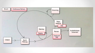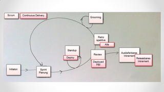 Das Dokument behandelt die Integration von Scrum und Continuous Delivery zur Steigerung der Innovationsfähigkeit in Softwareentwicklungsprozessen. Es wird erläutert, wie durch kürzere Feedbackzyklen und eine stärkere Fokussierung auf den Kunden der Prozess effizienter gestaltet werden kann. Ziel ist es, Produkte schneller und benutzerzentriert zu entwickeln, um langfristig zufriedene Kunden und Unternehmen zu schaffen.