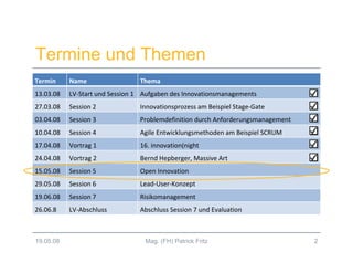 Das Dokument beschreibt einen Lehrveranstaltungsplan im Rahmen des Innovationsmanagements 2.0 unter der Leitung von Mag. (FH) Patrick Fritz. Es listet die Termine und Themen der einzelnen Sessions auf, die verschiedene Aspekte des Innovationsmanagements behandeln, wie z.B. den Innovationsprozess, agile Entwicklungsmethoden und Risikomanagement. Die Agenda für die letzten Sessions enthält strukturierte Schritte zur Problemanalyse und Zieldefinition.