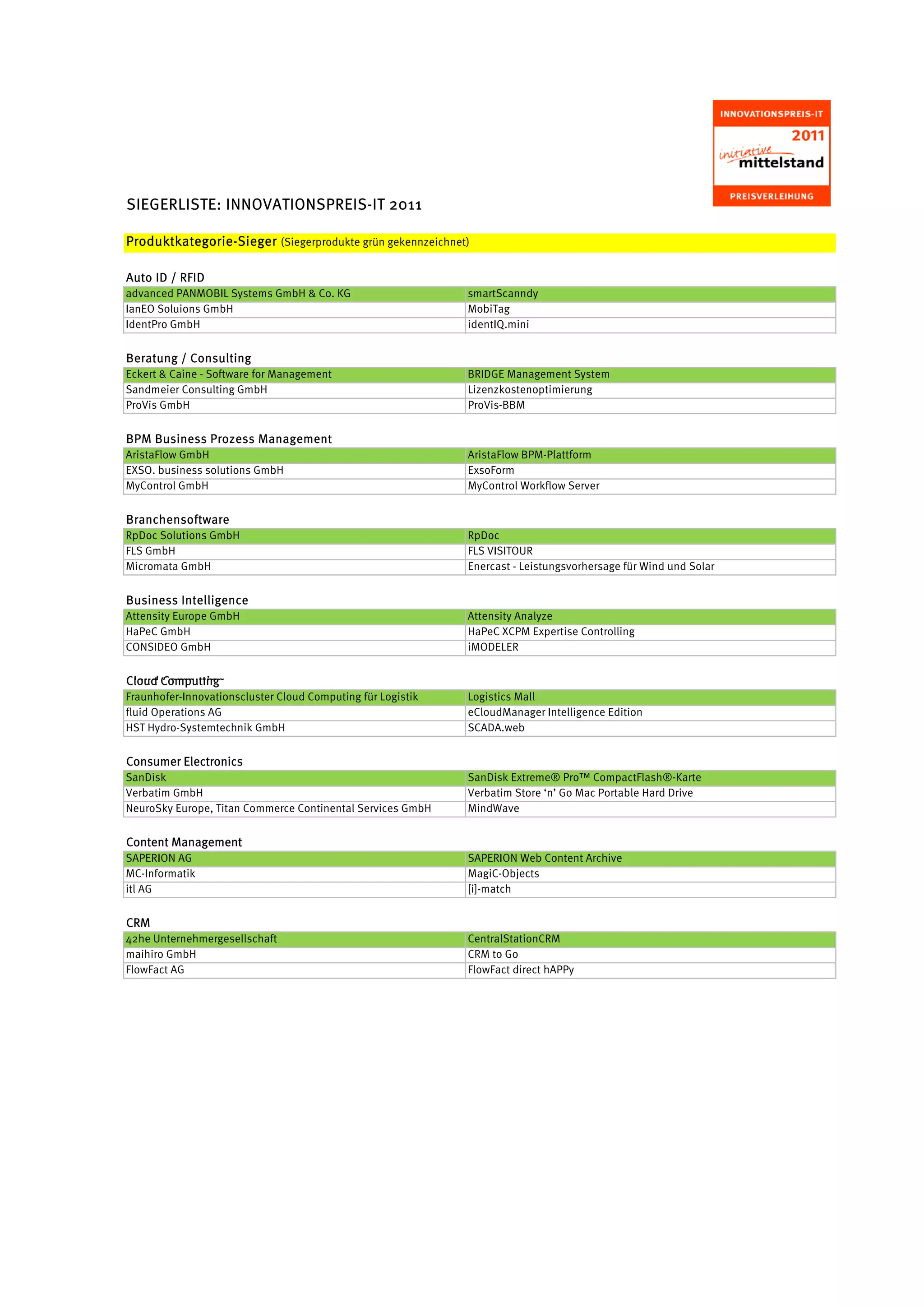 Das Dokument listet die Siegerprodukte des Innovationspreis IT 2011 in verschiedenen Produktkategorien, einschließlich Software für Management, Cloud Computing, Consumer Electronics und Unternehmensressourcen. Es werden zahlreiche Unternehmen und ihre ausgezeichneten Produkte aufgeführt, die in verschiedenen Bereichen wie E-Learning, CRM, Logistik und IT-Sicherheit tätig sind. Weitere Informationen über die Siegerprodukte und die Preisverleihung sind auf der angegebenen Website erhältlich.