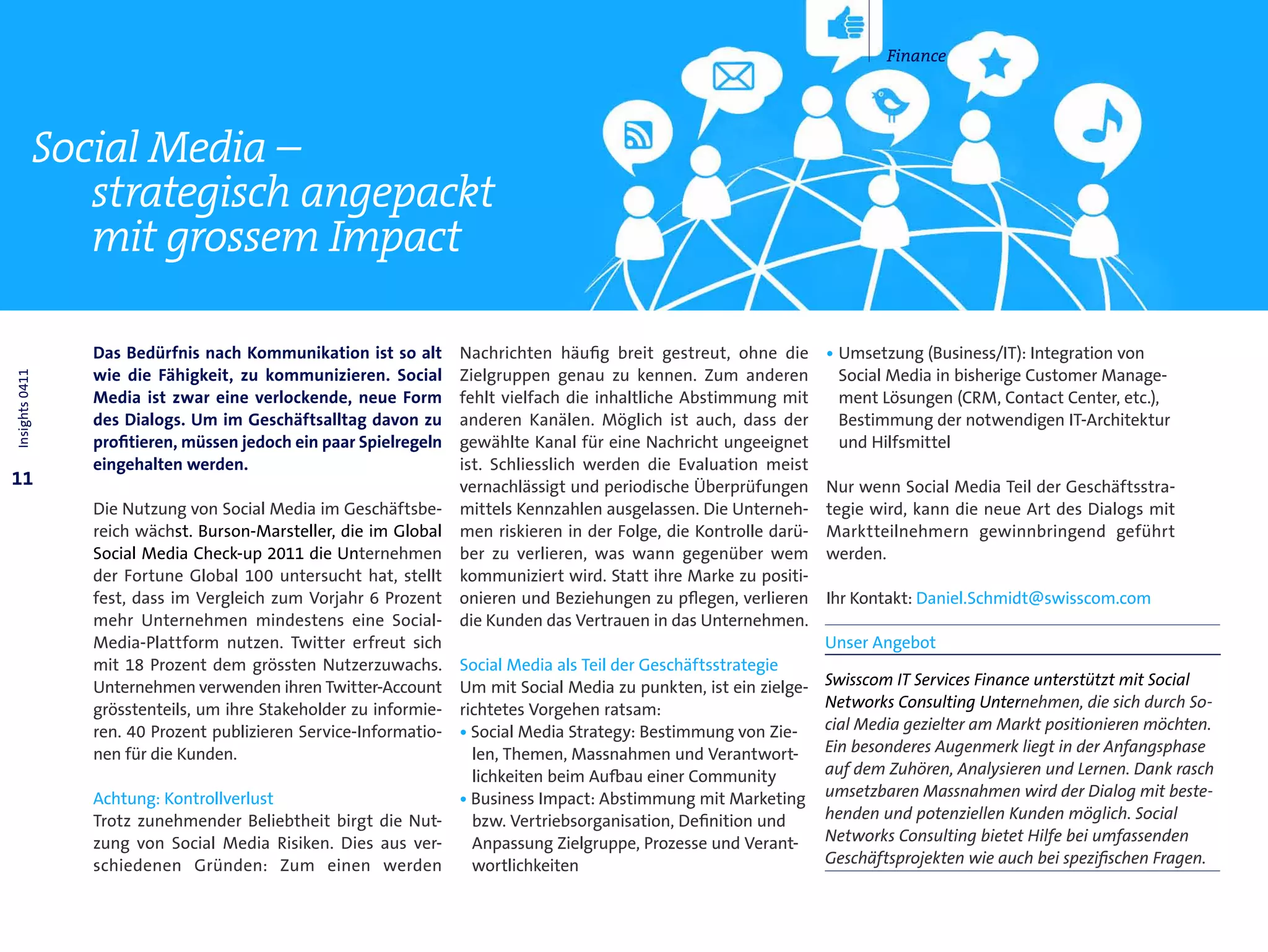 Das Dokument hebt die Bedeutung von Social Media in der Geschäftswelt hervor und betont die Notwendigkeit einer strategischen Integration in bestehende Kommunikationskanäle. Es wird auf die Risiken hingewiesen, die mit der Nutzung von Social Media verbunden sind, einschließlich potenziellen Kontrollverlusts über die Markenkommunikation. Zudem wird die Rolle von Schweizer Unternehmen, insbesondere Swisscom, in der Unterstützung von Social Media-Strategien und der Notwendigkeit von sorgfältiger Planung und Evaluation betont.