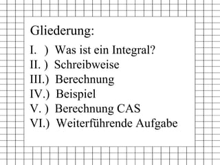 Das Dokument behandelt das Thema Integralrechnung und beschreibt die Definition, Schreibweise, Berechnungsmethoden sowie ein praktisches Beispiel. Es erläutert die Schritte zur Aufstellung der Stammfunktion sowie die Berechnung des Integrals zwischen zwei Grenzen anhand eines Beispiels und der Nutzung eines Computer-Algebra-Systems (CAS). Zusätzlich wird eine weiterführende Aufgabe zur Berechnung der Fläche zwischen zwei Funktionen vorgestellt.
