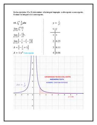 Das Dokument behandelt die Berechnung von uneigentlichen Integralen, einschließlich der Bestimmung ihrer Konvergenz oder Divergenz. Es werden verschiedene Beispiele von Integralen sowie die entsprechenden Berechnungen präsentiert. Der Fokus liegt auf der Anwendung von Grenzwerten und der Analyse der Stabilität der Integrale unter bestimmten Bedingungen.