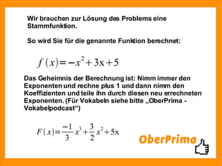 Das Dokument beschreibt die Berechnung des Flächeninhalts einer Funktion durch die Verwendung einer Stammfunktion und die Anwendung der Integralrechnung. Es erklärt, dass die Grenzen der Fläche durch Nullstellen mit der pq-Formel ermittelt werden und gibt Anweisungen zur Berechnung des Flächeninhalts. Zudem werden Ressourcen und Unterstützung für weitere Fragen angeboten, um das Verständnis für Mathematik zu fördern.