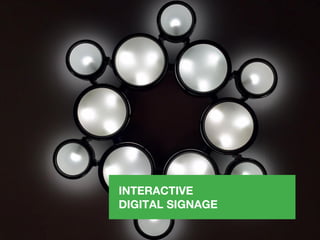 Das Dokument beschreibt interaktive digitale Beschilderungssysteme, die ein Netzwerk aus Displays mit zentraler Verwaltung und zeitgesteuerten Inhalten bieten, einschließlich Text, Animationen und Videos. Es hebt die Möglichkeiten der Benutzerinteraktion mithilfe von Touch-Anwendungen, QR-Codes und Datenaufzeichnung hervor. Zudem werden technische Spezifikationen eines tragbaren interaktiven Touch-Plakats erwähnt, das für Innen- und Außeneinsätze geeignet ist.