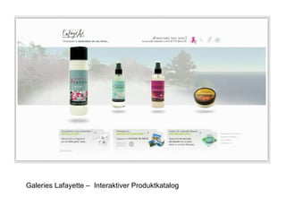 Das Dokument beschreibt verschiedene interaktive Kataloge und Präsentationen, darunter produktbezogene Detailansichten von Galeries Lafayette und Presto sowie Firmengeschichten in Fotobuch-Format. Zudem werden spezielle interaktive Elemente wie ein 3D-Geländeplan von Futuroscope in Frankreich und eine interaktive Video-Einladung von Lamborghini erwähnt, sowie eine interaktive Timeline von Volkswagen. Insgesamt zeigt das Dokument innovative Ansätze zur Präsentation von Produkten und Unternehmensgeschichten.