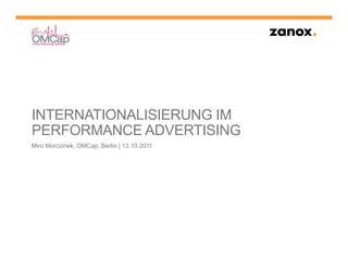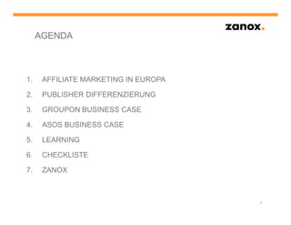 Das Dokument behandelt die Internationalisierung im Performance Advertising mit einem Fokus auf Affiliate-Marketing in Europa. Es analysiert die Marktverteilung, Publisher-Differenzierung in verschiedenen Ländern und enthält Case Studies von Groupon und ASOS sowie eine Checkliste für Advertiser zur Internationalisierung. Abschließend wird die Entwicklung des mobilen Traffic und die Rolle des Zanox VIP Clubs für leistungsstarke Publisher hervorgehoben.