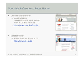Das Dokument bietet einen umfassenden Überblick über Internet-Marketing und insbesondere Suchmaschinenoptimierung (SEO) sowie Suchmaschinenmarketing (SEM). Es wird die Bedeutung von Online-Produktinformationen für Kaufentscheidungen hervorgehoben und die wichtigsten Schritte zur Optimierung von Webseiten erläutert, einschließlich Keyword-Recherche und On-Page-Optimierung. Außerdem wird zwischen 'White Hat' und 'Black Hat' SEO unterschieden, wobei die Bedeutung von ethischer Optimierung und Benutzerfreundlichkeit betont wird.
