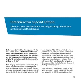 Das Interview mit Niels Pfläging beleuchtet die Herausforderungen und Veränderungen in der Arbeitswelt sowie die Rolle von Teams und Organisationen für den Erfolg. Pfläging argumentiert, dass tiefgreifende Veränderungen nicht bei einzelnen Führungspersonen, sondern in der systematischen Gestaltung von Organisationen ansetzen müssen, um die Effektivität zu steigern. Er kritisiert das traditionelle Führungsverständnis und betont die Notwendigkeit einer kollektiven Verantwortung für Veränderungen innerhalb von Teams und Organisationen.