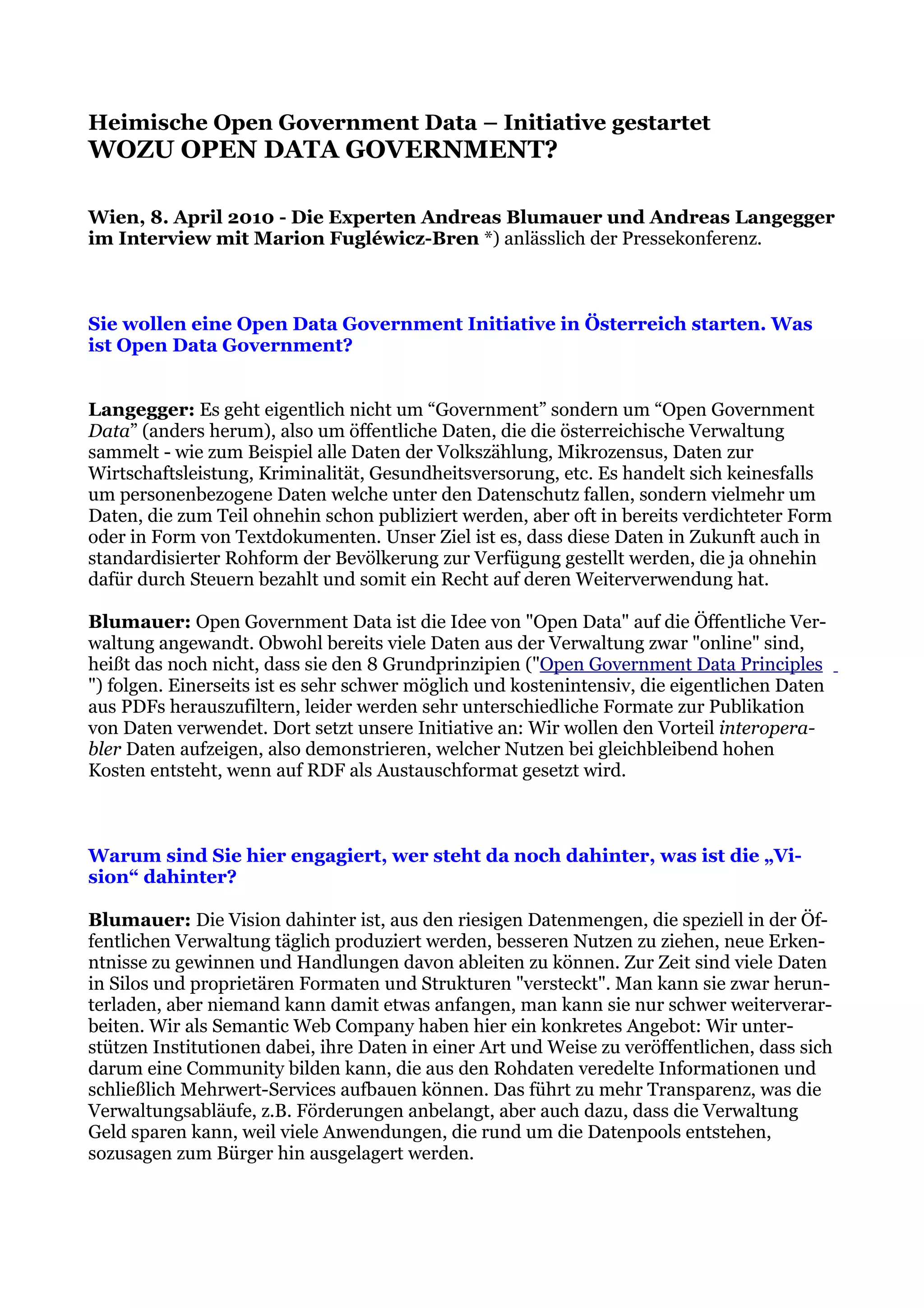 In einer Pressekonferenz am 8. April 2010 wurden die Pläne für eine Open Data Government-Initiative in Österreich vorgestellt, die darauf abzielt, öffentliche Verwaltungsdaten in standardisierter Rohform der Bevölkerung zugänglich zu machen. Ziel ist es, mehr Transparenz zu schaffen, Daten effizienter zu nutzen und neue Services zu entwickeln, um die Verwaltungskosten zu senken und den Bürgern einen besseren Zugang zu Informationen zu ermöglichen. Die Initiative verfolgt auch politische und wirtschaftliche Interessen und soll durch die Schaffung eines rechtlichen Rahmens zur Veröffentlichung von Daten die Nutzung dieser Informationen fördern.