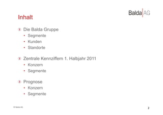 Die Balda AG präsentiert im August 2011 ein Update zu ihren Segmenten Medical, Electronic Products und Mobilecom, wobei das Medical-Segment das wachstumsstärkste darstellt, während Mobilecom mit Herausforderungen konfrontiert ist. Die finanziellen Kennzahlen zeigen eine stabilisierte Entwicklung bei einem Anstieg der Umsätze und des operativen Ergebnisses, besonders im Medical-Segment. Für 2011 wird ein Umsatz von 70 bis 80 Millionen Euro und ein leicht positives operatives Ergebnis prognostiziert, während eine Akquisition im medizinischen Bereich angestrebt wird.
