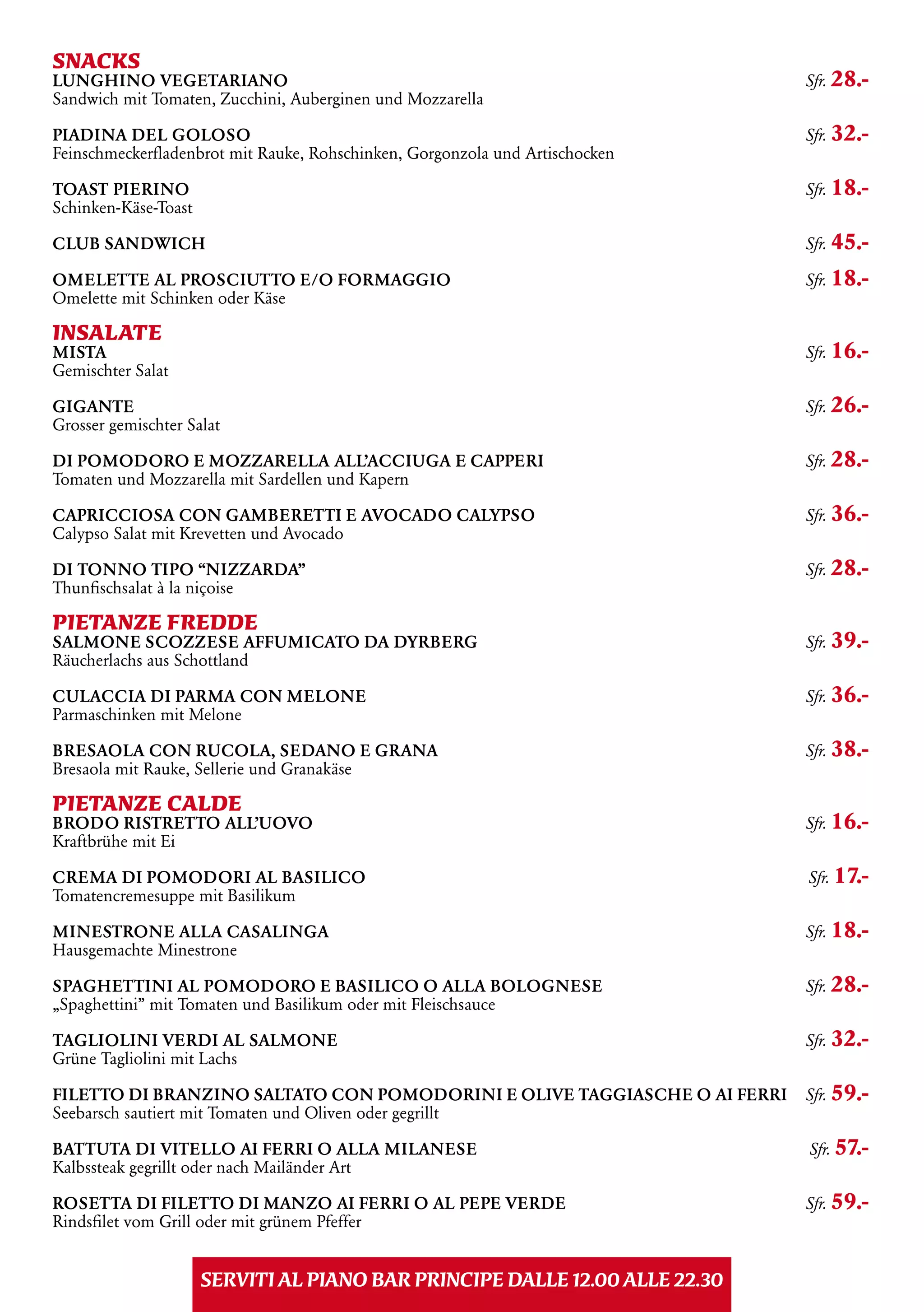 Das Dokument listet eine Vielzahl von Speisen und Getränken in einem Restaurant auf, einschließlich vegetarischer Snacks, Salate, kalte und warme Gerichte sowie Desserts. Es enthält außerdem Informationen zu einem Piano-Bar-Event, das von 20:00 bis 01:00 Uhr mit Live-Musik stattfindet und zu dem eine Reservierung empfohlen wird. Die Kontaktdaten und die Website des Restaurants sind ebenfalls enthalten.