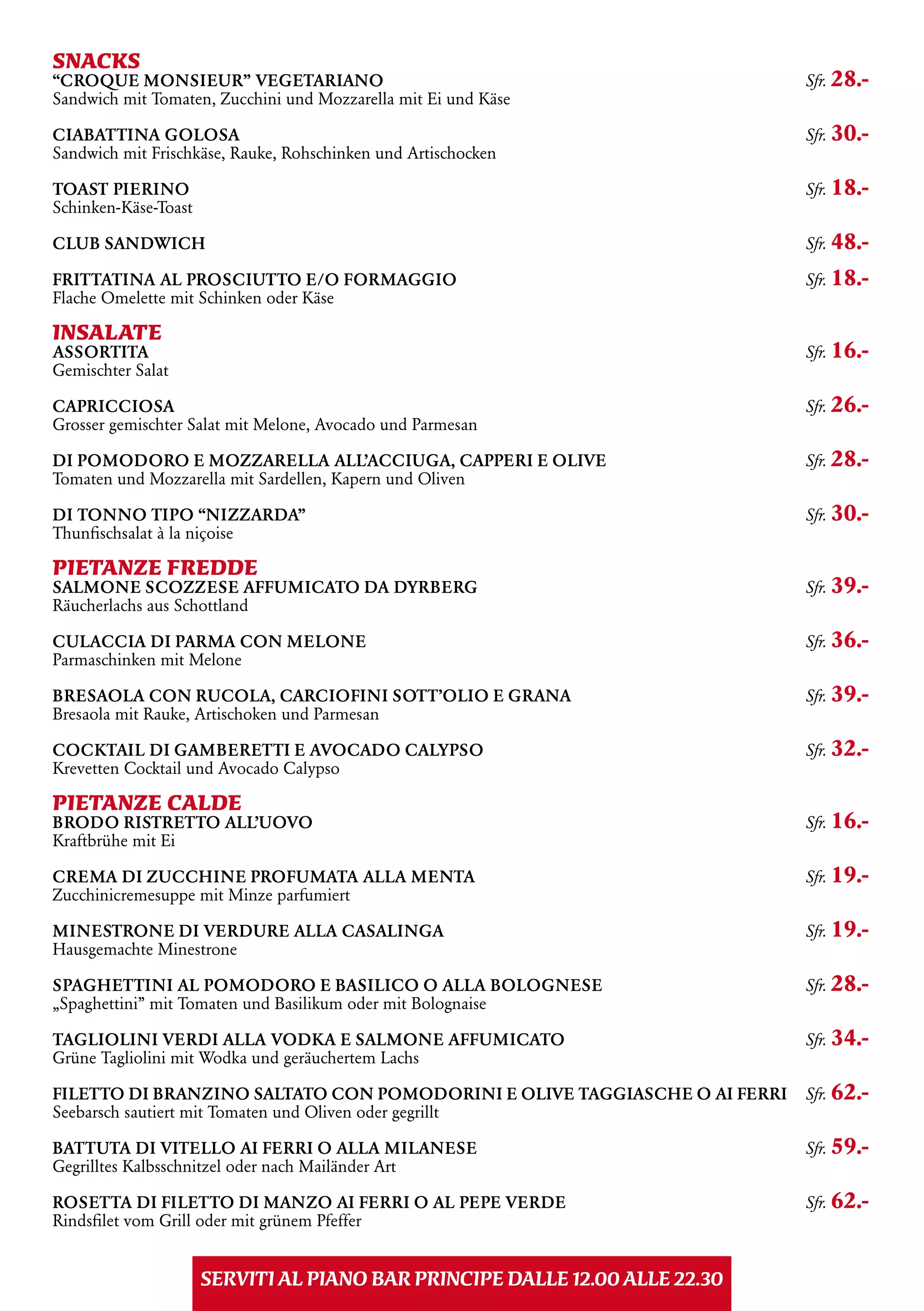 Das Dokument listet eine Vielzahl an Snacks und Gerichten, einschließlich vegetarischer Sandwiches, verschiedenen Salaten, kalten und warmen Speisen sowie besonderen Getränken an der Musik Bar Principe in Lugano. Es wird auf die angebotenen Live-Musik abends sowie die Möglichkeit, Snacks und alternative Abendessen zu genießen, hingewiesen. Reservierungen werden empfohlen, und das Restaurant hat täglich von 12:00 bis 22:30 Uhr geöffnet.