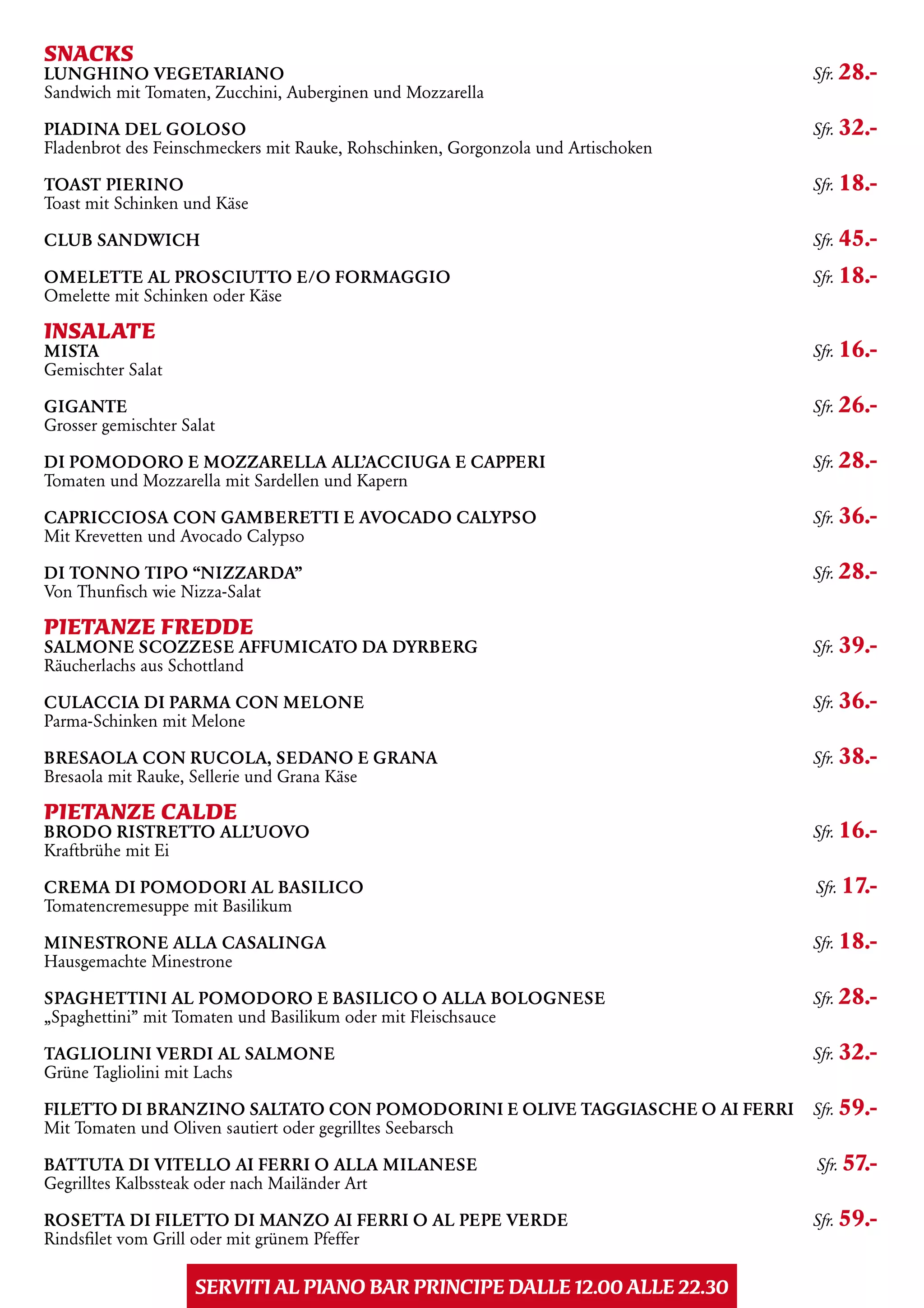 Das Dokument listet eine Vielzahl an Snacks und Gerichten, die in einem Restaurant angeboten werden, einschließlich Salaten, Suppen, Pasta und Fleischgerichten mit Preisen. Zusätzlich werden musikalische Veranstaltungen und spezielle Whisky-Probieraktionen im Musikbar Principe angekündigt. Es enthält auch Kontaktdaten und Informationen zur Reservierung.