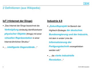 Das Dokument behandelt die Beziehung zwischen dem Internet der Dinge (IoT) und Industrie 4.0, wobei es verschiedene Perspektiven und Assoziationen der beiden Konzepte diskutiert. Es werden Fragen zum Einfluss des IoT auf verschiedene Branchen, zur Rolle des Internets in der Industrie 4.0 und zu spezifischen Szenarien gestellt. Das Fazit betont, dass beide Begriffe zwar Überschneidungen aufweisen, jedoch nicht klar definiert sind, und dass praktische Anwendungen wichtiger sind als theoretische Diskussionen.