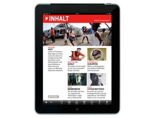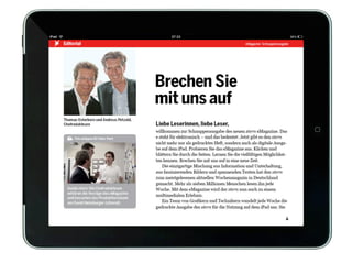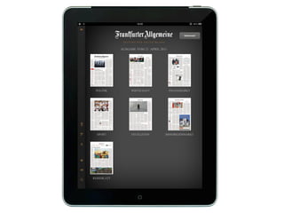 Das Dokument analysiert die Bedeutung des iPads als Medium für journalistische Inhalte und erläutert dessen Marktstellung mit einem 83% Marktanteil im Jahr 2010 sowie eine hohe Nutzungsdauer im Vergleich zu Print- und Webinhalten. Es werden Nutzungsmuster und demografische Informationen über die iPad-Nutzer präsentiert, die überwiegend hohe Einkommen haben. Zudem werden Geschäftsmodelle für digitale Nachrichten erörtert, wobei insbesondere die Möglichkeit von micropayment-basierten Systemen hervorgehoben wird.