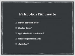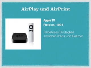 Das Dokument behandelt den Einsatz von iPads im Klassenzimmer, einschließlich der Vorteile wie Mobilität und Benutzerfreundlichkeit sowie der Herausforderungen wie Kosten und Datenschutz. Es werden verschiedene Apps vorgestellt und deren Nutzen im Unterricht diskutiert, wobei auch auf die Notwendigkeit einer Abkehr vom Frontalunterricht eingegangen wird. Der Text schließt mit Hinweisen auf technische Aspekte und Sicherheitsüberlegungen, die mit der Nutzung von iPads verbunden sind.