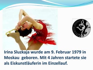 Irina Sluzkaja, geboren am 9. Februar 1979 in Moskau, ist eine erfolgreiche Eiskunstläuferin, die 2002 und 2005 Weltmeisterin sowie 1996 bis 2006 Europameisterin war. Neben dem Sport arbeitet sie als Moderatorin und Schauspielerin im russischen Fernsehen und ist Mutter von zwei Kindern. Ihr Vorbild ist inspirierend für viele, darunter die Autorin Tatjana Solotkowa.